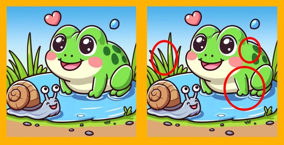 Tak co, jste připraveni na další výzvu? Podívejte se pozorně na dva obrázky žáby a šneka. Na první pohled mohou vypadat stejně, ale jsou mezi nimi tři malé rozdíly. Myslíte si, že je všechny najdete za 17 sekund? Zkuste to a otestujte svou ostrost zraku!