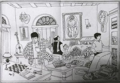 5. Nejmladší osobou na obrázku je chlapec vpravo. Prohlíží si knihy. Když se však podíváte na jeho košili, všimnete si, že na jedné straně má dlouhý rukáv a na druhé straně tříčtvrteční rukáv.