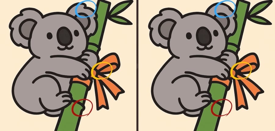 Tak co, jste připraveni na další výzvu? Podívejte se pozorně na dva obrázky koaly objímající bambus. Na první pohled mohou vypadat stejně, ale jsou mezi nimi tři malé rozdíly. Myslíte, že je všechny najdete za 33 sekund? Zkuste to a otestujte svou ostrost zraku!